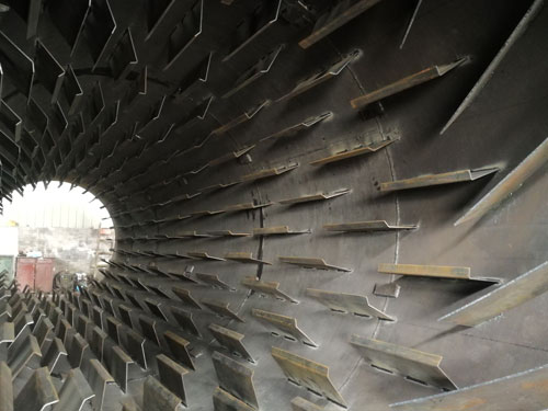 要想將干粉砂漿烘干到合理的水分,烘干機的安裝工藝和設計工藝非常重要,由于粉狀物料流動性不如固體物料,干粉砂漿烘干機的安裝需要設計一個合理的傾斜角度,能讓物料在被烘干的過程中勻速流動,這個流速需要達到剛好物料到出口處時被烘干,所以傾斜角度的設計很重要。然后是設計工藝,粉狀物料會由于重力的作用沉積,要想充分將其烘干,必須進行打散揚起,讓高溫氣流從物料種穿過,這就對筒體內的設計工藝提出要求,除了安裝揚料板,還要對排布位置,間距、密度等參數有一個合理的設計。